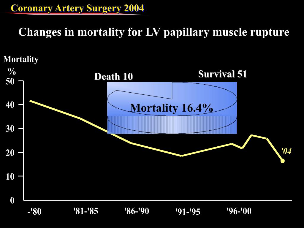 Survival 51 Death 10 Mortality 16.4% Changes in mortality for LV papillary muscle rupture