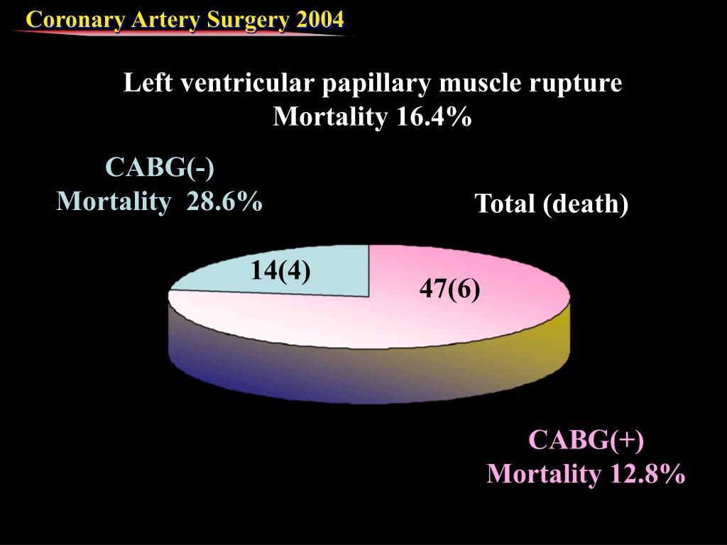 CABG(-) Mortality 28.6% Total (death) 14(4) 47(6) CABG(+) Mortality 12.8% Left ventricular papillary muscle rupture Mortality 16.4%