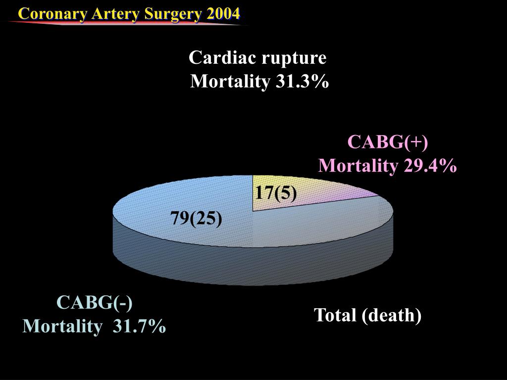 CABG(+) Mortality 29.4% 17(5) 79(25) CABG(-) Mortality 31.7% Total (death) Cardiac rupture Mortality 31.3%