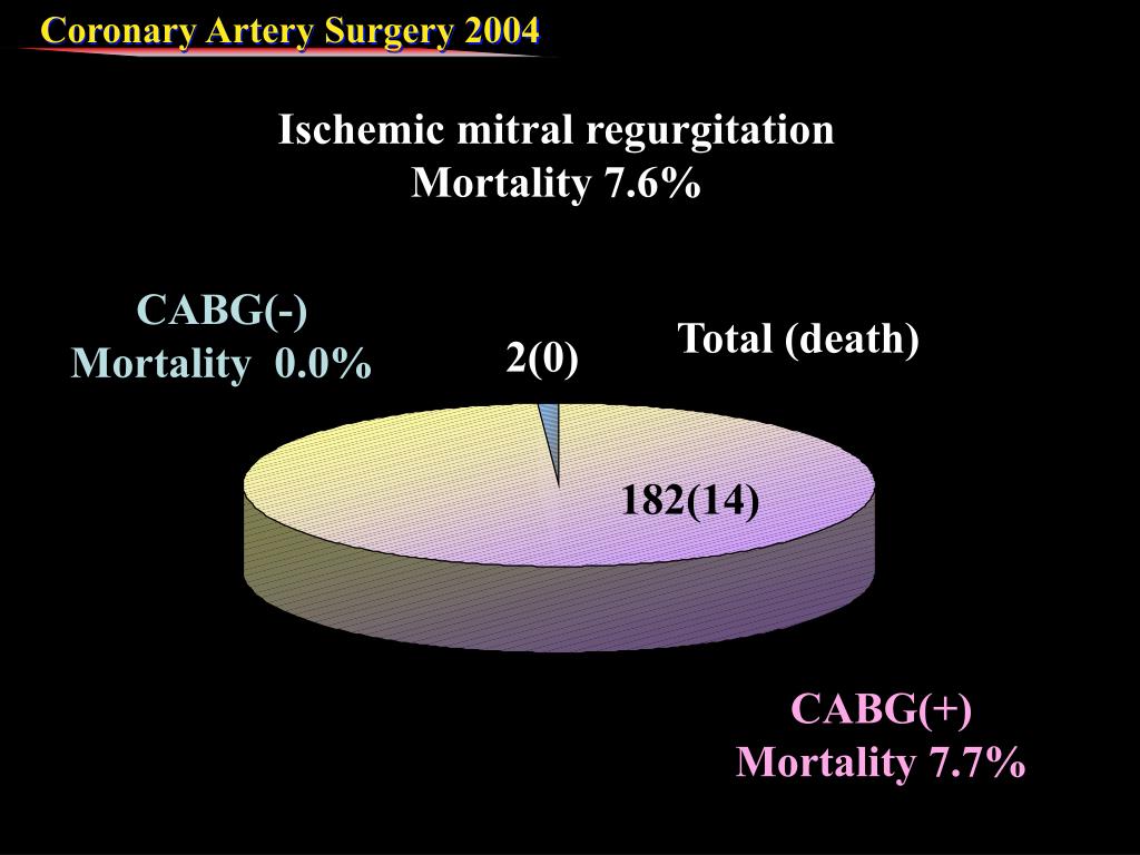 CABG(-) Mortality 0.0% Total (death) 2(0) 182(14) CABG(+) Mortality 7.7% Ischemic mitral regurgitation Mortality 7.6%