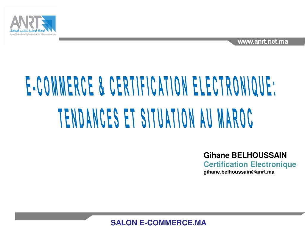 E-COMMERCE & CERTIFICATION ELECTRONIQUE: TENDANCES ET SITUATION AU MAROC. Gihane BELHOUSSAIN Certification Electronique gihane.belhoussain@anrt.ma. SALON E-COMMERCE.MA. PLAN. INTRODUCTION. ECHANGES ELECTRONIQUES ET E-COMMERCE. PKI & CERTIFICAT ELECTRONIQUE.
