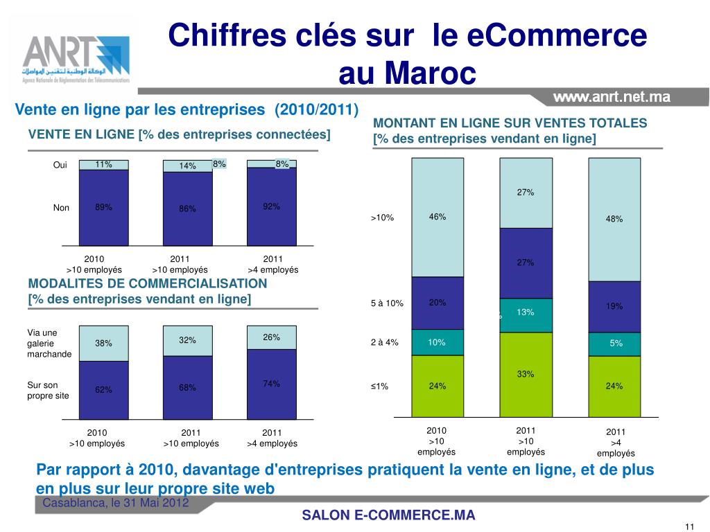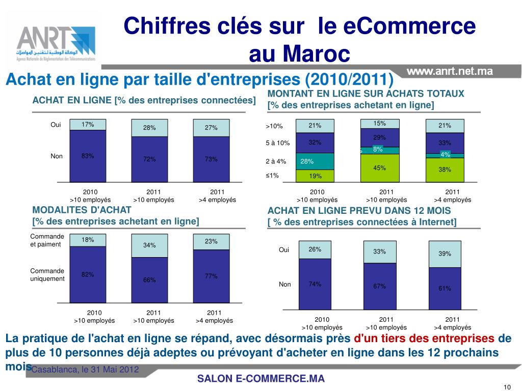 Chiffres clés sur le eCommerce au Maroc Achat en ligne par taille d'entreprises (2010/2011) MONTANT EN LIGNE SUR ACHATS TOTAUX [% des entreprises achetant en ligne] ACHAT EN LIGNE [% des entreprises connectées] Oui >10% 5 à 10% 8% 11% 4% Non 2 à 4% 28% ≤1% 2010 >10 employés 2011 >10 employés 2011 >4 employés 2010 >10 employés 2011 >10 employés 2011 >4 employés MODALITES D'ACHAT [% des entreprises achetant en ligne] ACHAT EN LIGNE PREVU DANS 12 MOIS [ % des entreprises connectées à Internet] Commande et paiment Oui Commande uniquement Non 2010 >10 employés 2011 >10 employés 2011 >4 employés 2010 >10 employés 2011 >10 employés 2011 >4 employés Lapratique de l'achat en ligne se répand, avec désormais près d'un tiers des entreprises de plus de 10 personnes déjà adeptes ou prévoyant d'acheter en ligne dans les 12 prochains mois SALON E-COMMERCE.MA