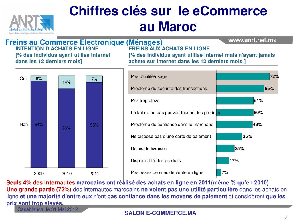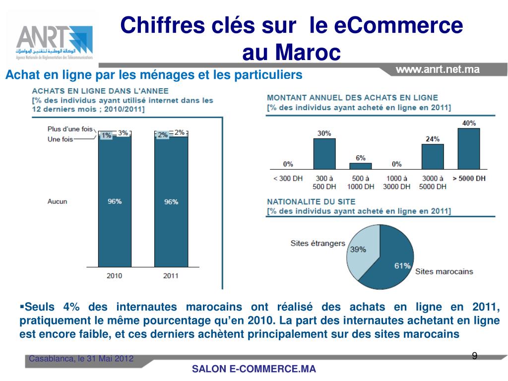 Chiffres clés sur le eCommerce au Maroc Achat en ligne par les ménages et les particuliers • Seuls 4% des internautes marocains ont réalisé des achats en ligne en 2011, pratiquement le même pourcentage qu’en 2010. La part des internautes achetant en ligne est encore faible, et ces derniers achètent principalement sur des sites marocains SALON E-COMMERCE.MA