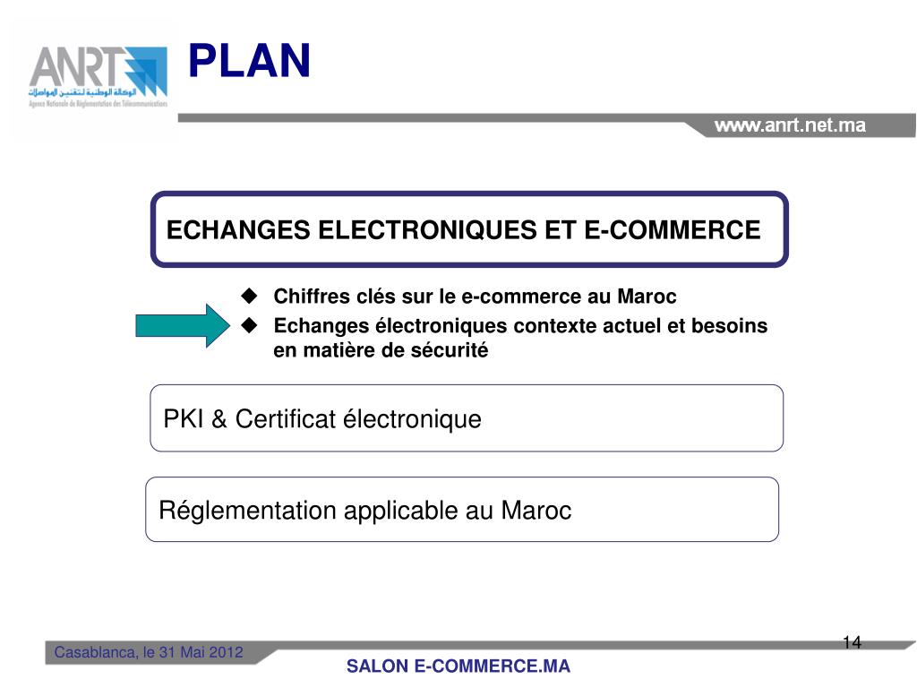 PLAN ECHANGES ELECTRONIQUES ET E-COMMERCE • Chiffres clés sur le e-commerce au Maroc • Echanges électroniques contexte actuel et besoins en matière de sécurité PKI & Certificat électronique Réglementation applicable au Maroc SALON E-COMMERCE.MA