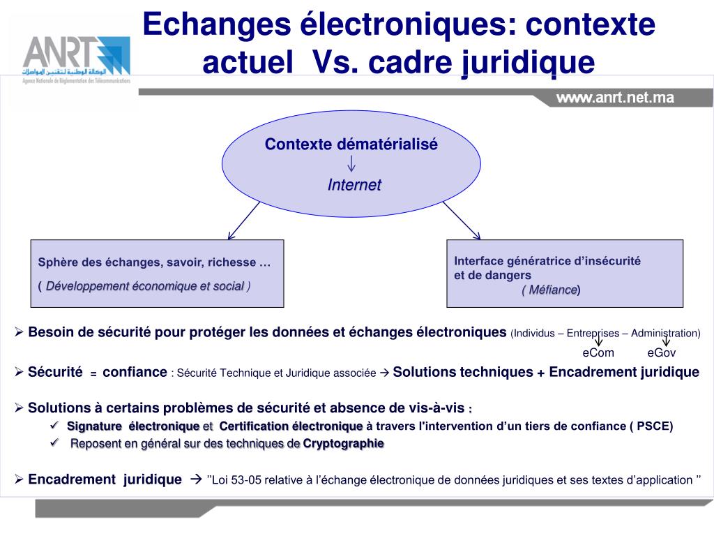Echanges électroniques: contexte actuel Vs. cadre juridique • Besoin de sécurité pour protéger les données et échanges électroniques (Individus – Entreprises – Administration) • eCom eGov • Sécurité= confiance : Sécurité Technique et Juridique associée Solutions techniques + Encadrement juridique • Solutions à certains problèmes de sécurité et absence de vis-à-vis : • Signature électronique et Certification électronique à travers l'intervention d’un tiers de confiance ( PSCE) • Reposent en général sur des techniques de Cryptographie • Encadrement juridique ’’Loi 53-05 relative à l’échange électronique de données juridiques et ses textes d’application ’’ Contexte dématérialisé Internet Sphère des échanges, savoir, richesse … ( Développement économique et social ) Interface génératrice d’insécurité et de dangers ( Méfiance)