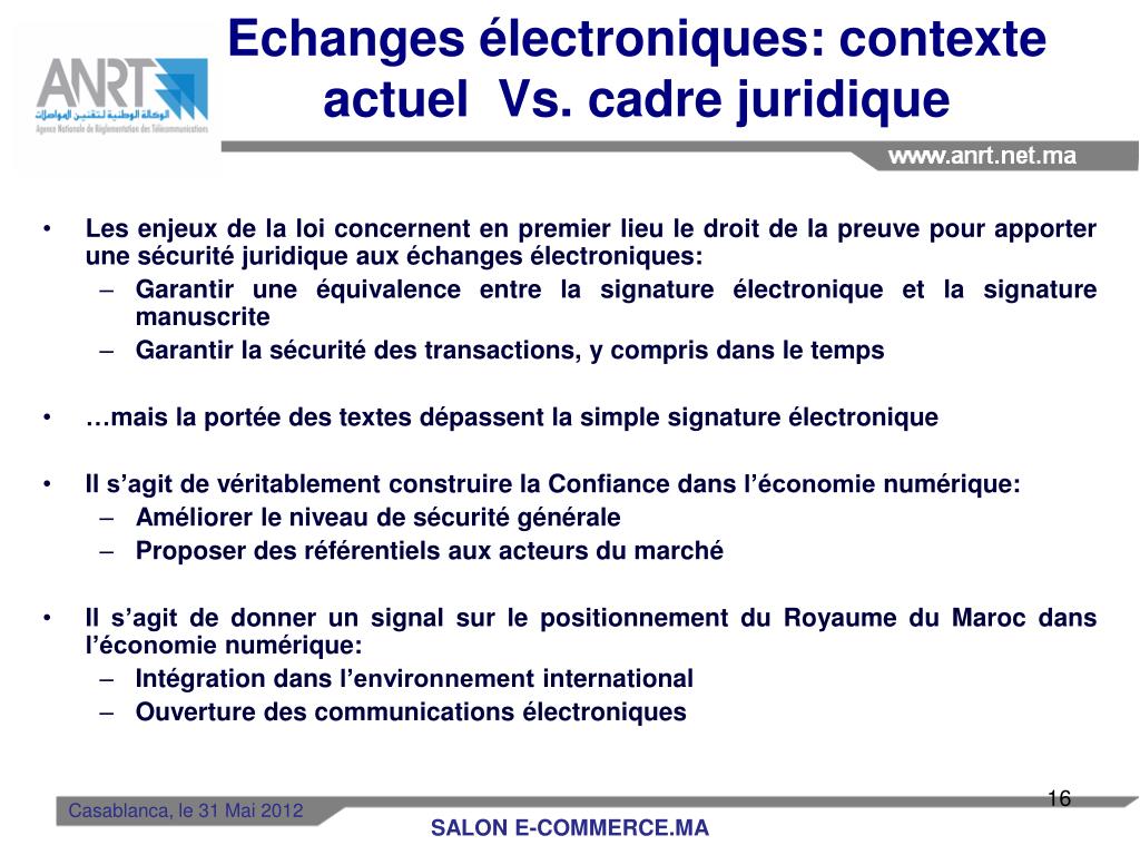 Echanges électroniques: contexte actuel Vs. cadre juridique • Les enjeux de la loi concernent en premier lieu le droit de la preuve pour apporter une sécurité juridique aux échanges électroniques: • Garantir une équivalence entre la signature électronique et la signature manuscrite • Garantir la sécurité des transactions, y compris dans le temps • …mais la portée des textes dépassent la simple signature électronique • Il s’agit de véritablement construire la Confiance dans l’économie numérique: • Améliorer le niveau de sécurité générale • Proposer des référentiels aux acteurs du marché • Il s’agit de donner un signal sur le positionnement du Royaume du Maroc dans l’économie numérique: • Intégration dans l’environnement international • Ouverture des communications électroniques SALON E-COMMERCE.MA