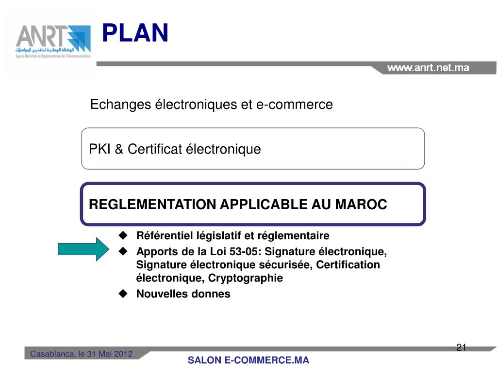 PLAN Echanges électroniques et e-commerce PKI & Certificat électronique REGLEMENTATION APPLICABLE AU MAROC • Référentiel législatif et réglementaire • Apports de la Loi 53-05: Signature électronique, Signature électronique sécurisée, Certification électronique, Cryptographie • Nouvelles donnes SALON E-COMMERCE.MA