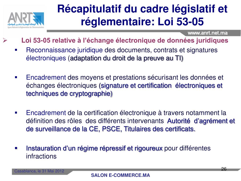 Récapitulatif du cadre législatif et réglementaire: Loi 53-05 • Loi 53-05 relative à l’échange électronique de données juridiques • Reconnaissance juridique des documents, contrats et signatures électroniques (adaptation du droit de la preuve au TI) • Encadrement des moyens et prestations sécurisant les données et échanges électroniques (signature et certification électroniques et techniques de cryptographie) • Encadrement de la certification électronique à travers notamment la définition des rôles des différents intervenants Autorité d’agrément et de surveillance de la CE, PSCE, Titulaires des certificats. • Instauration d’un régime répressif et rigoureux pour différentes infractions SALON E-COMMERCE.MA