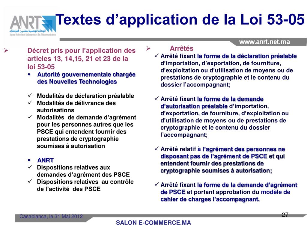 Textes d’application de la Loi 53-05 • Décret pris pour l’application des articles 13, 14,15, 21 et 23 de la loi 53-05 • Autorité gouvernementale chargée des Nouvelles Technologies • Modalités de déclaration préalable • Modalités de délivrance des autorisations • Modalités de demande d’agrément pour les personnes autres que les PSCE qui entendent fournir des prestations de cryptographie soumises à autorisation • ANRT • Dispositions relatives aux demandes d’agrément des PSCE • Dispositions relatives au contrôle de l’activité des PSCE • Arrêtés • Arrêté fixant la forme de la déclaration préalabled’importation, d’exportation, de fourniture, d’exploitation ou d’utilisation de moyens ou de prestations de cryptographie et le contenu du dossier l’accompagnant; • Arrêté fixant la forme de la demande d’autorisation préalabled’importation, d’exportation, de fourniture, d’exploitation ou d’utilisation de moyens ou de prestations de cryptographie et le contenu du dossier l’accompagnant; • Arrêté relatif à l’agrément des personnes ne disposant pas de l’agrément de PSCE et qui entendent fournir des prestations de cryptographie soumises à autorisation; • Arrêté fixant la forme de la demande d’agrément de PSCEet portant approbation du modèle de cahier de charges l’accompagnant. SALON E-COMMERCE.MA