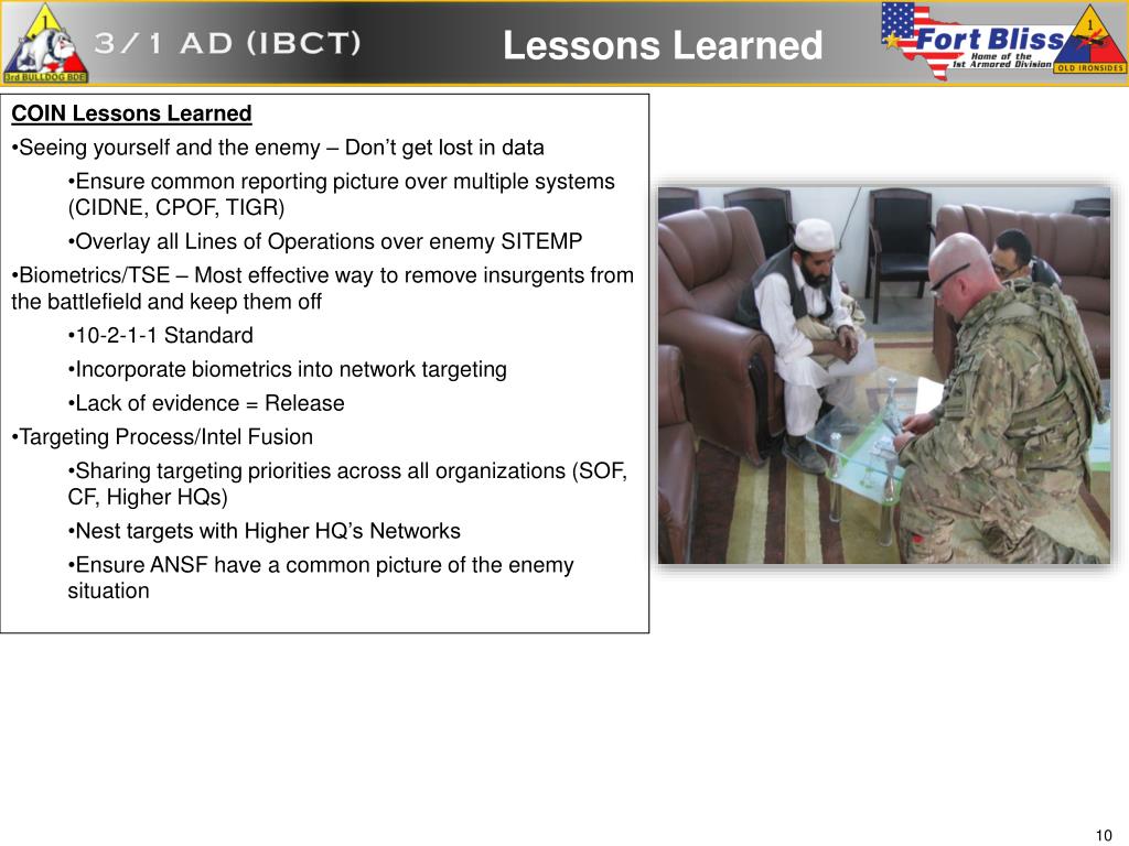 Lessons Learned • COIN Lessons Learned • Seeing yourself and the enemy – Don’t get lost in data • Ensure common reporting picture over multiple systems (CIDNE, CPOF, TIGR) • Overlay all Lines of Operations over enemy SITEMP • Biometrics/TSE – Most effective way to remove insurgents from the battlefield and keep them off • 10-2-1-1 Standard • Incorporate biometrics into network targeting • Lack of evidence = Release • Targeting Process/Intel Fusion • Sharing targeting priorities across all organizations (SOF, CF, Higher HQs) • Nest targets with Higher HQ’s Networks • Ensure ANSF have a common picture of the enemy situation