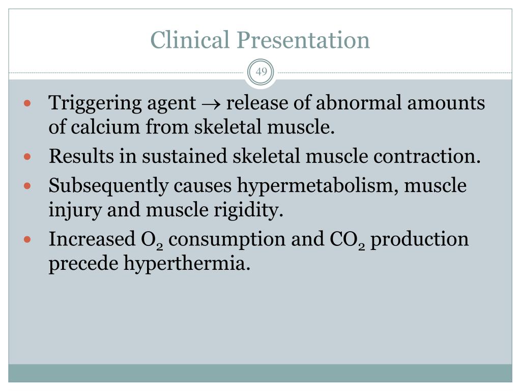 Clinical Presentation • Triggering agent release of abnormal amounts of calcium from skeletal muscle. • Results in sustained skeletal muscle contraction. • Subsequently causes hypermetabolism, muscle injury and muscle rigidity. • Increased O2 consumption and CO2 production precede hyperthermia.
