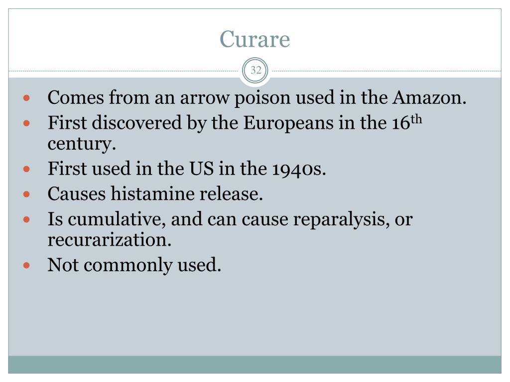Curare • Comes from an arrow poison used in the Amazon. • First discovered by the Europeans in the 16th century. • First used in the US in the 1940s. • Causes histamine release. • Is cumulative, and can cause reparalysis, or recurarization. • Not commonly used.