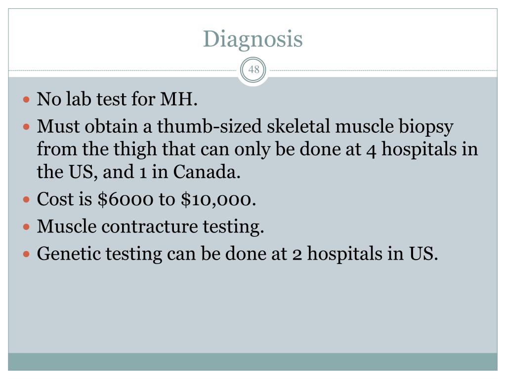 Diagnosis • No lab test for MH. • Must obtain a thumb-sized skeletal muscle biopsy from the thigh that can only be done at 4 hospitals in the US, and 1 in Canada. • Cost is $6000 to $10,000. • Muscle contracture testing. • Genetic testing can be done at 2 hospitals in US.