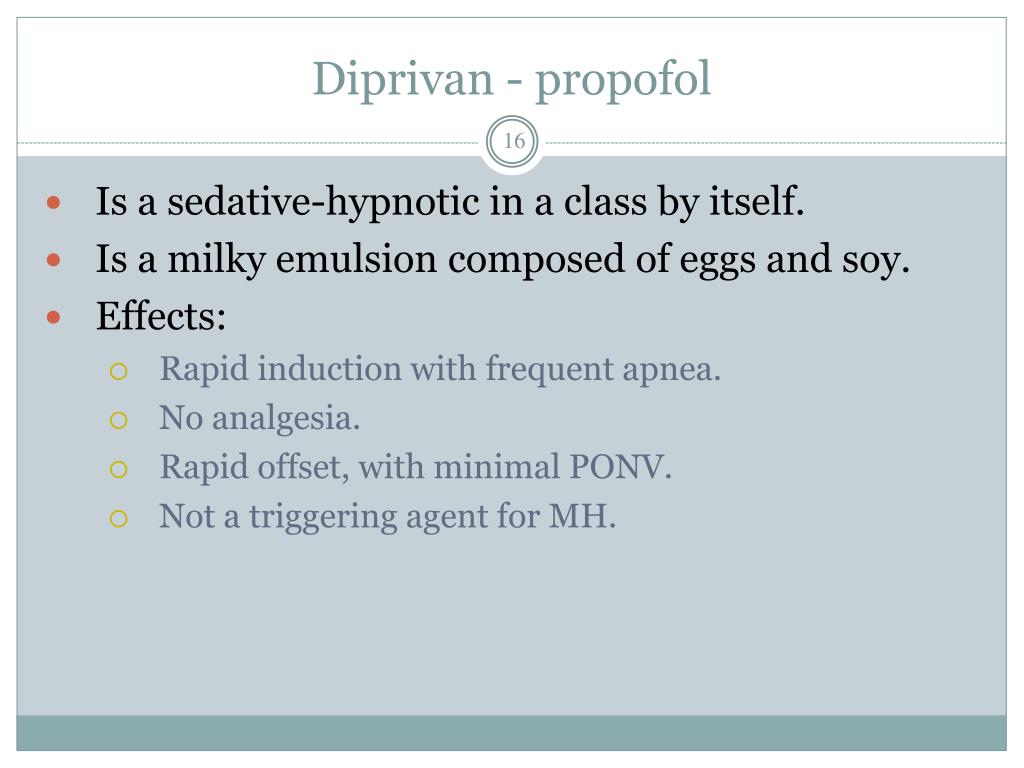 Diprivan - propofol • Is a sedative-hypnotic in a class by itself. • Is a milky emulsion composed of eggs and soy. • Effects: • Rapid induction with frequent apnea. • No analgesia. • Rapid offset, with minimal PONV. • Not a triggering agent for MH.