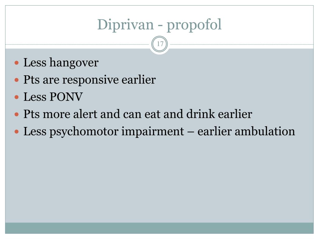 Diprivan - propofol • Less hangover • Pts are responsive earlier • Less PONV • Pts more alert and can eat and drink earlier • Less psychomotor impairment – earlier ambulation