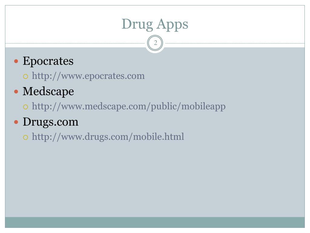 Drug Apps • Epocrates • http://www.epocrates.com • Medscape • http://www.medscape.com/public/mobileapp • Drugs.com • http://www.drugs.com/mobile.html