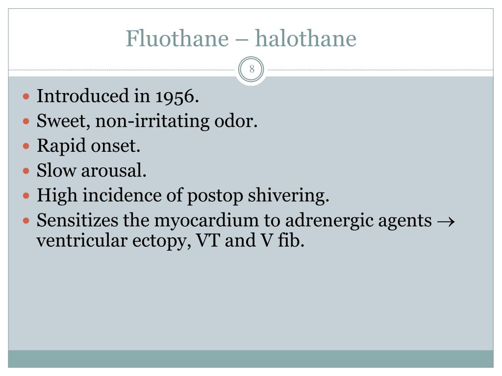 Fluothane – halothane • Introduced in 1956. • Sweet, non-irritating odor. • Rapid onset. • Slow arousal. • High incidence of postop shivering. • Sensitizes the myocardium to adrenergic agents ventricular ectopy, VT and V fib.