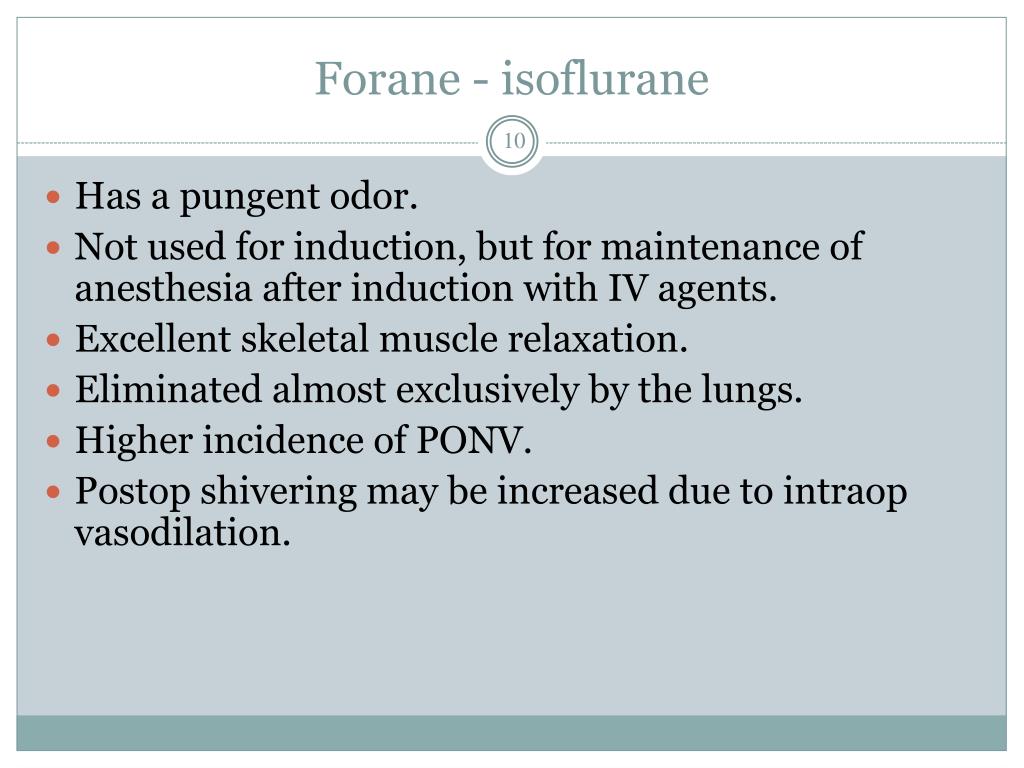 Forane - isoflurane • Has a pungent odor. • Not used for induction, but for maintenance of anesthesia after induction with IV agents. • Excellent skeletal muscle relaxation. • Eliminated almost exclusively by the lungs. • Higher incidence of PONV. • Postop shivering may be increased due to intraop vasodilation.