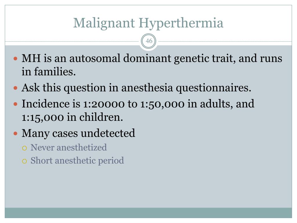 Malignant Hyperthermia • MH is an autosomal dominant genetic trait, and runs in families. • Ask this question in anesthesia questionnaires. • Incidence is 1:20000 to 1:50,000 in adults, and 1:15,000 in children. • Many cases undetected • Never anesthetized • Short anesthetic period