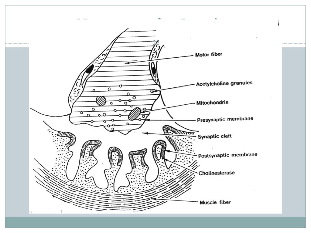 Neuromuscular Junction • Nerve impulse causes release of acetylcholine (ACh) into the synaptic cleft. • ACh diffuses across the synaptic cleft, and binds on the post-synaptic fibers of a muscle fiber. • Results in a membrane depolarization, and a muscle contraction.