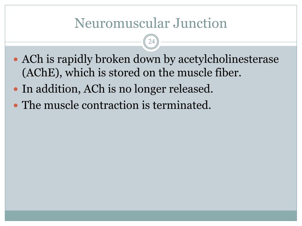 Neuromuscular Junction • ACh is rapidly broken down by acetylcholinesterase (AChE), which is stored on the muscle fiber. • In addition, ACh is no longer released. • The muscle contraction is terminated.