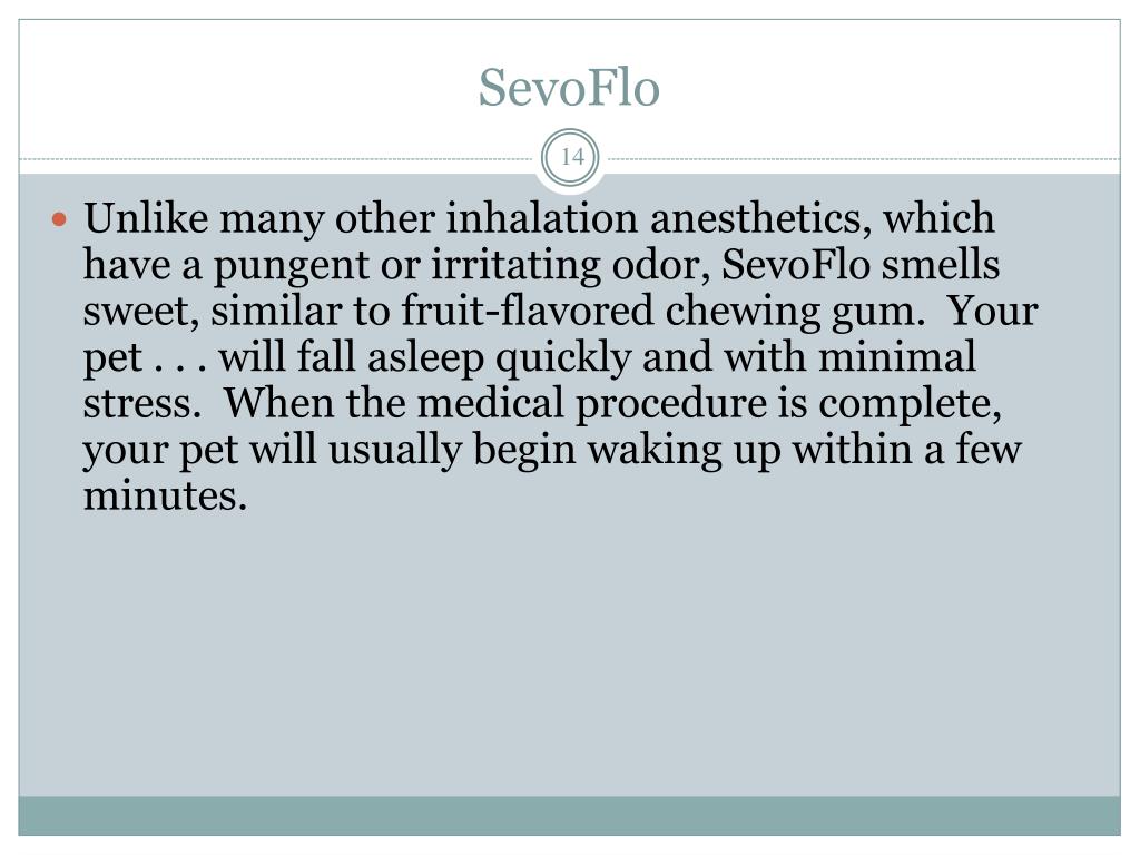 SevoFlo • Unlike many other inhalation anesthetics, which have a pungent or irritating odor, SevoFlo smells sweet, similar to fruit-flavored chewing gum. Your pet . . . will fall asleep quickly and with minimal stress. When the medical procedure is complete, your pet will usually begin waking up within a few minutes.