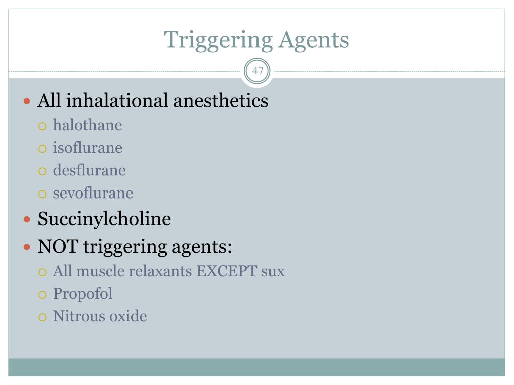 Triggering Agents • All inhalational anesthetics • halothane • isoflurane • desflurane • sevoflurane • Succinylcholine • NOT triggering agents: • All muscle relaxants EXCEPT sux • Propofol • Nitrous oxide