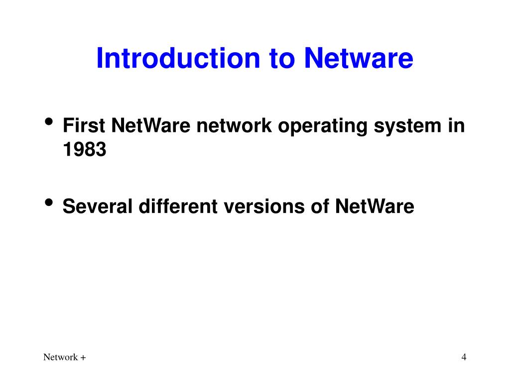 Introduction to Netware • First NetWare network operating system in 1983 • Several different versions of NetWare