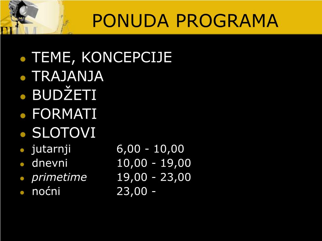 PONUDA PROGRAMA • TEME, KONCEPCIJE • TRAJANJA • BUDŽETI • FORMATI • SLOTOVI • jutarnji 6,00 - 10,00 • dnevni 10,00 - 19,00 • primetime 19,00 - 23,00 • noćni 23,00 -