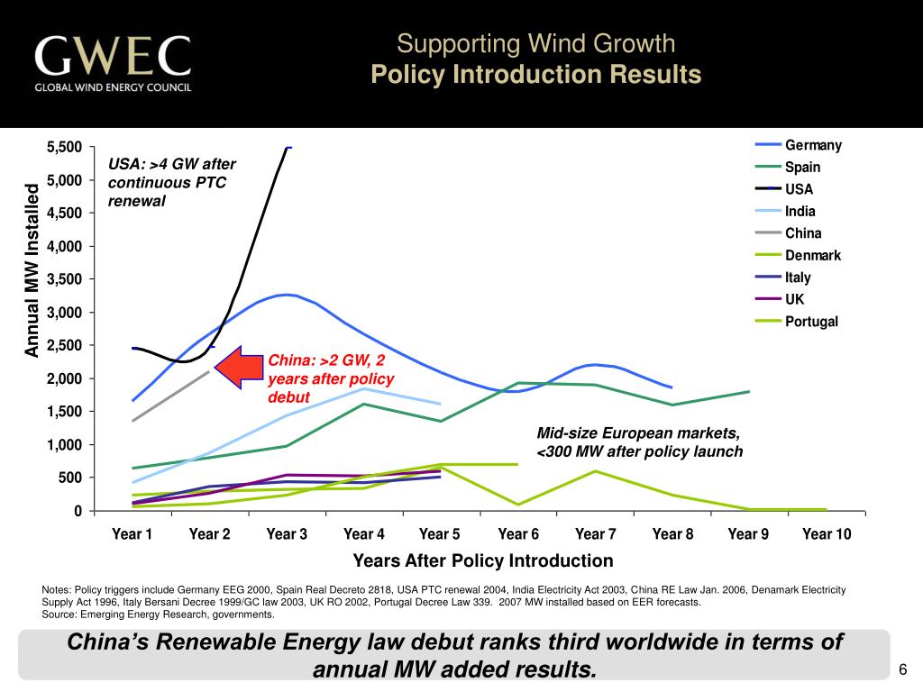 Supporting Wind GrowthPolicy Introduction Results USA: >4 GW after continuous PTC renewal Annual MW Installed China: >2 GW, 2 years after policy debut Mid-size European markets, <300 MW after policy launch Years After Policy Introduction Notes: Policy triggers include Germany EEG 2000, Spain Real Decreto 2818, USA PTC renewal 2004, India Electricity Act 2003, China RE Law Jan. 2006, Denamark Electricity Supply Act 1996, Italy Bersani Decree 1999/GC law 2003, UK RO 2002, Portugal Decree Law 339. 2007 MW installed based on EER forecasts. Source: Emerging Energy Research, governments. China’s Renewable Energy law debut ranks third worldwide in terms of annual MW added results.