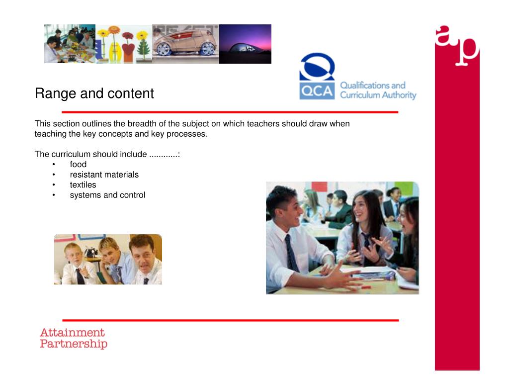 Range and content This section outlines the breadth of the subject on which teachers should draw when teaching the key concepts and key processes. The curriculum should include ............: • food • resistant materials • textiles • systems and control