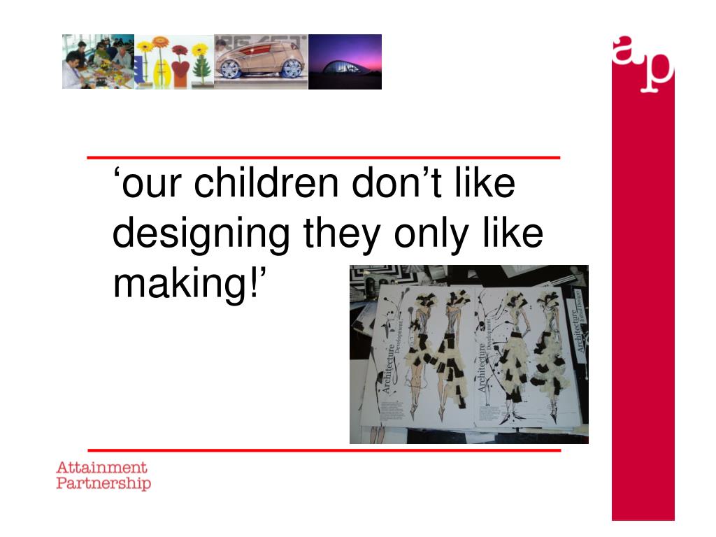 what do we do? • working in a variety of schools every week • The Design Museum (write and deliver all secondary CPD) • The Victoria and Albert Museum (write and deliver all secondary teaching and learning materials for design and technology) • The Design Council (member of the national ‘Design Skills’ advisory panel and chair of schools steering group) • Specialist Schools and Academies Trust SSAT • Qualifications and Curriculum Authority QCA (KS3 review group) • Teacher’s TV • Faraday lectures 09 • Detroit area Education Department, USA • Buffalo State University, New York USA • HoK architects • d&t association