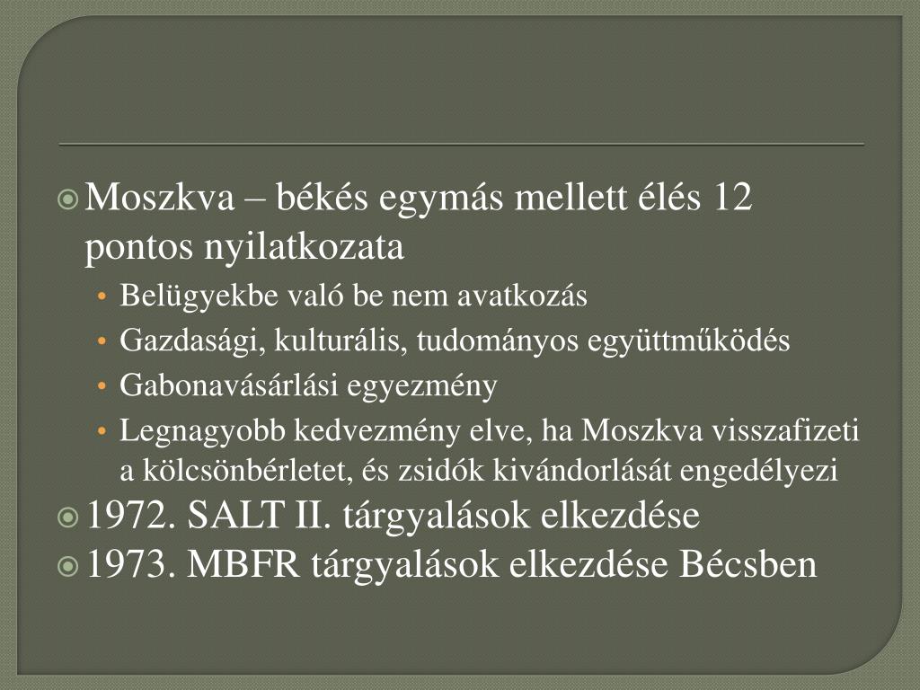Moszkva – békés egymás mellett élés 12 pontos nyilatkozata • Belügyekbe való be nem avatkozás • Gazdasági, kulturális, tudományos együttműködés • Gabonavásárlási egyezmény • Legnagyobb kedvezmény elve, ha Moszkva visszafizeti a kölcsönbérletet, és zsidók kivándorlását engedélyezi • 1972. SALT II. tárgyalások elkezdése • 1973. MBFR tárgyalások elkezdése Bécsben