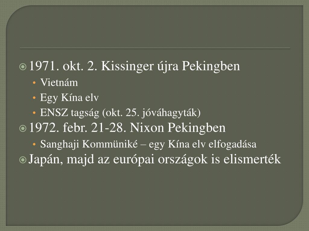 1971. okt. 2. Kissinger újra Pekingben • Vietnám • Egy Kína elv • ENSZ tagság (okt. 25. jóváhagyták) • 1972. febr. 21-28. Nixon Pekingben • Sanghaji Kommüniké – egy Kína elv elfogadása • Japán, majd az európai országok is elismerték