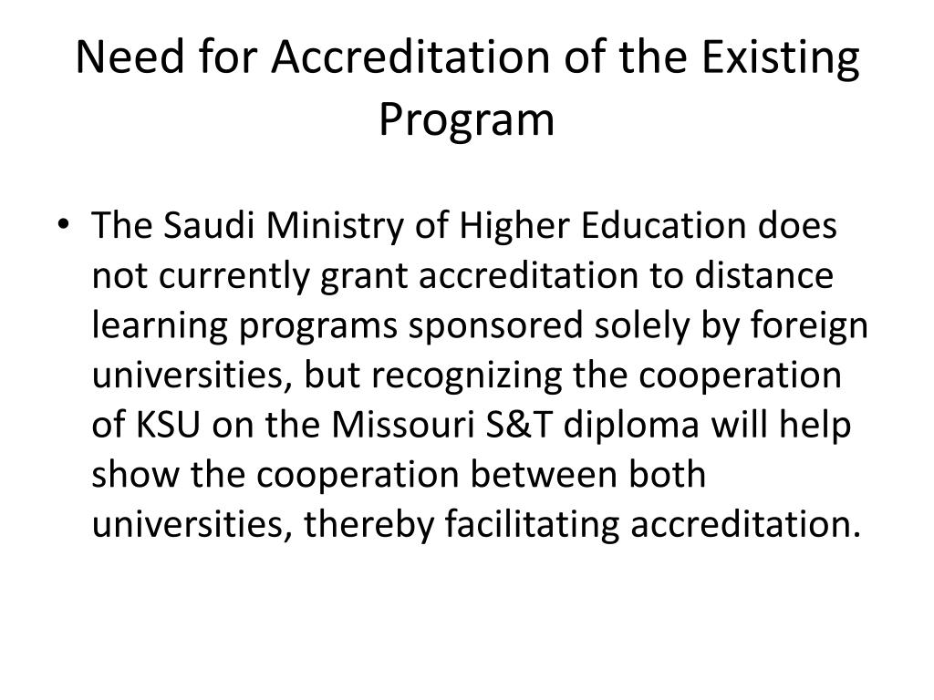 Need for Accreditation of the Existing Program • The Saudi Ministry of Higher Education does not currently grant accreditation to distance learning programs sponsored solely by foreign universities, but recognizing the cooperation of KSU on the Missouri S&T diploma will help show the cooperation between both universities, thereby facilitating accreditation.