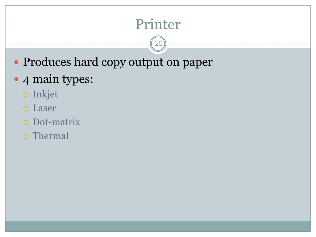 Printer • Produces hard copy output on paper • 4 main types: • Inkjet • Laser • Dot-matrix • Thermal