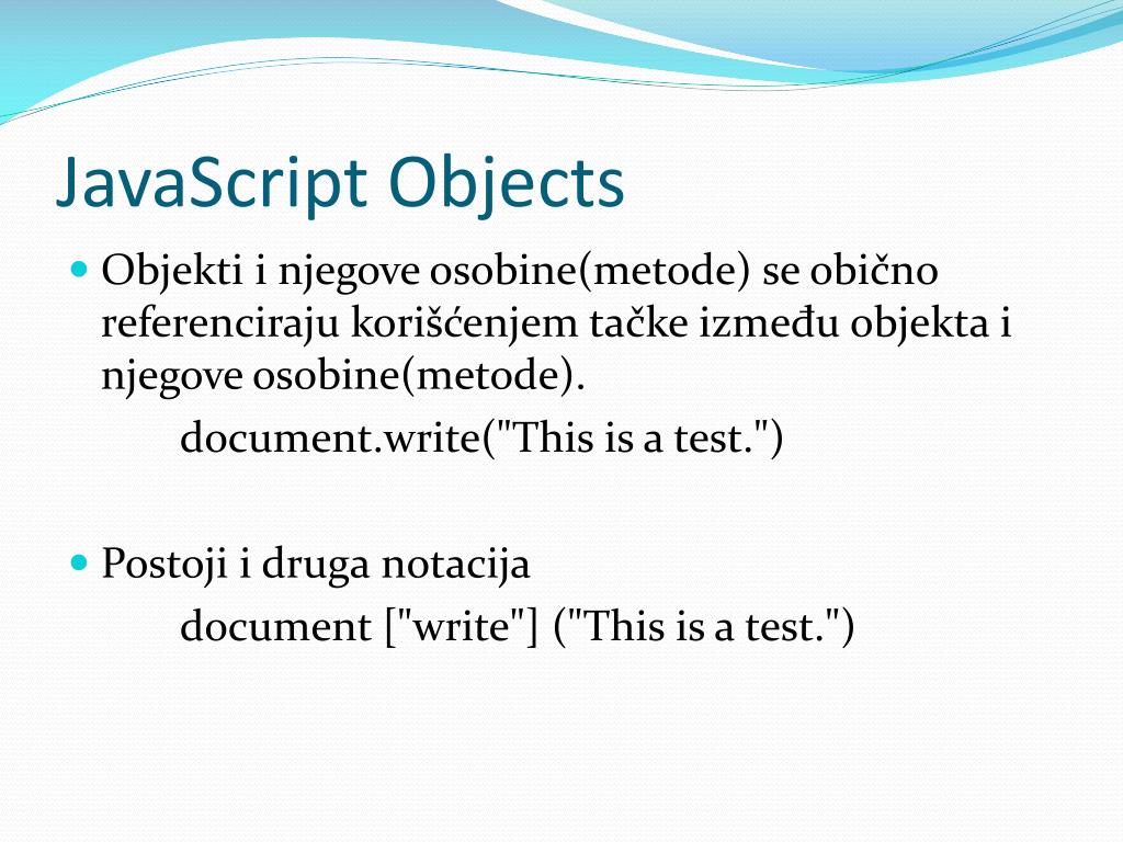 JavaScript Objects • Objekti i njegove osobine(metode) se obično referenciraju korišćenjem tačke između objekta i njegove osobine(metode). document.write("This is a test.") • Postoji i druga notacija document ["write"] ("This is a test.")