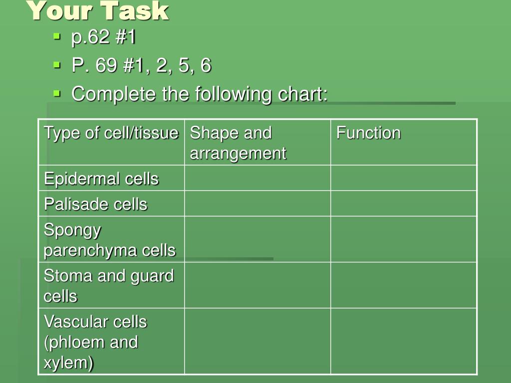 Your Task • p.62 #1 • P. 69 #1, 2, 5, 6 • Complete the following chart: