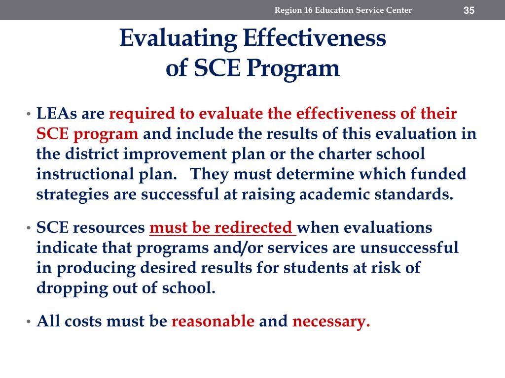 Region 16 Education Service Center Evaluating Effectiveness of SCE Program • LEAs are required to evaluate the effectiveness of their SCE program and include the results of this evaluation in the district improvement plan or the charter school instructional plan. They must determine which funded strategies are successful at raising academic standards. • SCE resources must be redirected when evaluations indicate that programs and/or services are unsuccessful in producing desired results for students at risk of dropping out of school. • All costs must be reasonableandnecessary.