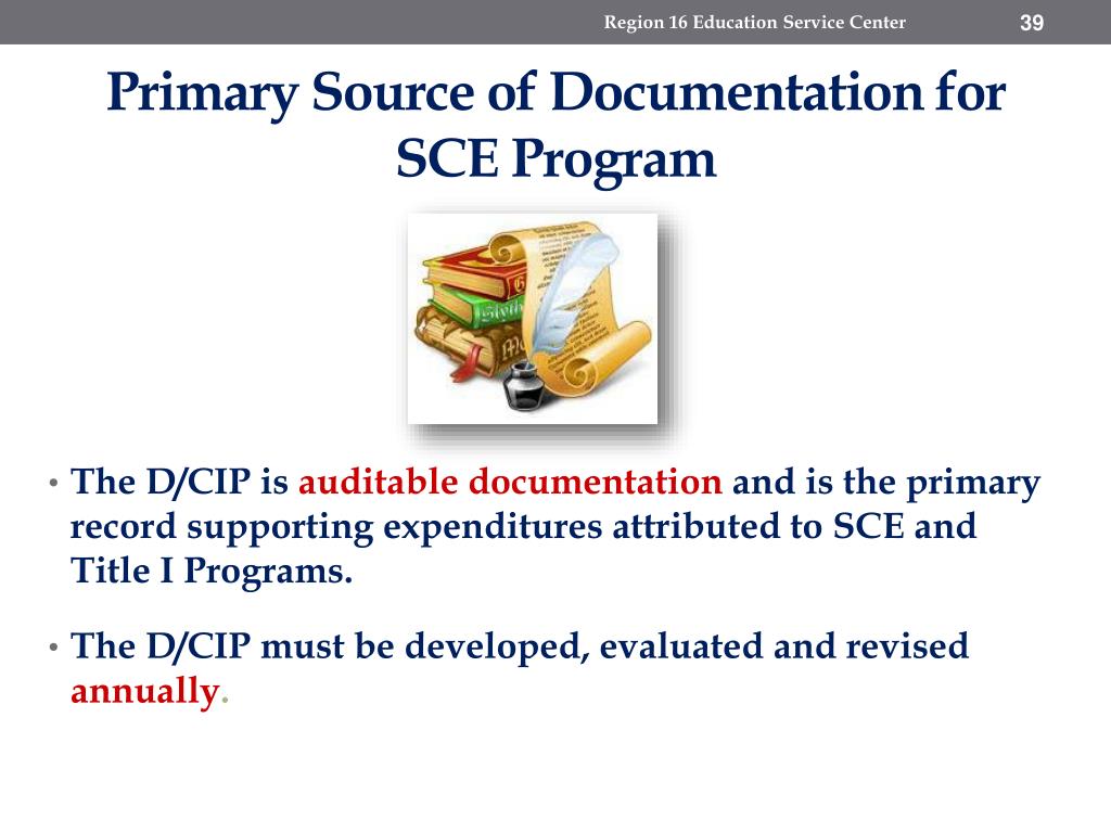 Region 16 Education Service Center Primary Source of Documentation for SCE Program • The D/CIP is auditable documentation and is the primary record supporting expenditures attributed to SCE and Title I Programs. • The D/CIP must be developed, evaluated and revised annually.