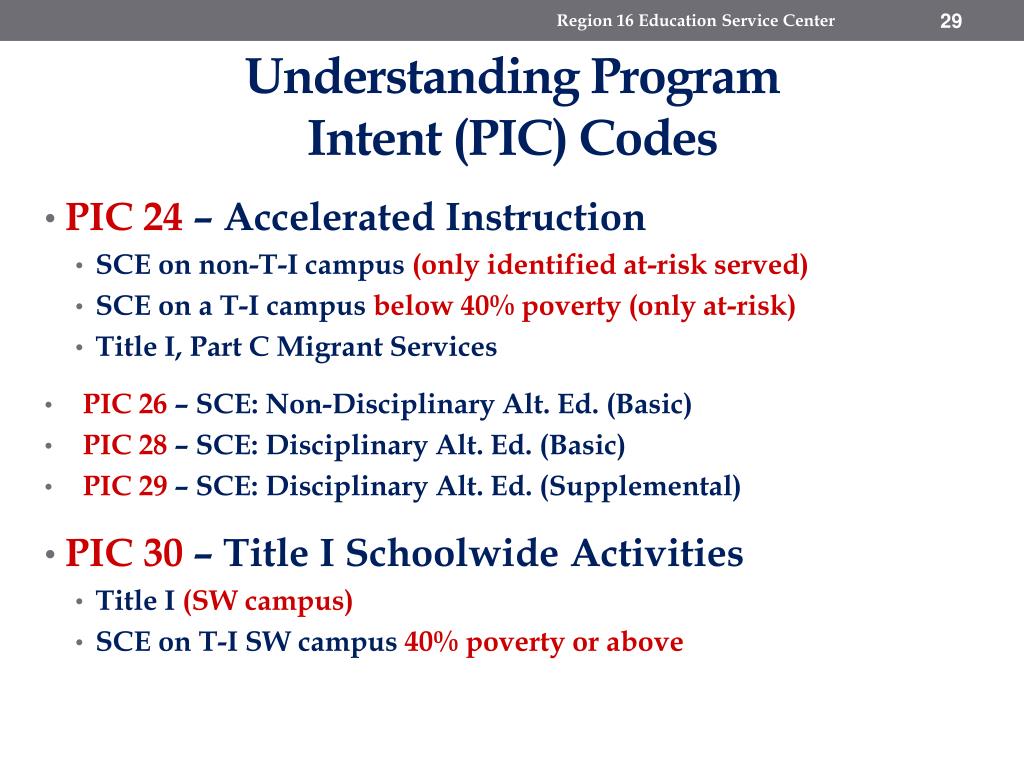 Region 16 Education Service Center Understanding Program Intent (PIC) Codes • PIC 24 – Accelerated Instruction • SCE on non-T-I campus (only identified at-risk served) • SCE on a T-I campus below 40% poverty (only at-risk) • Title I, Part C Migrant Services • PIC 26 – SCE: Non-Disciplinary Alt. Ed. (Basic) • PIC 28 – SCE: Disciplinary Alt. Ed. (Basic) • PIC 29 – SCE: Disciplinary Alt. Ed. (Supplemental) • PIC 30 – Title I Schoolwide Activities • Title I (SW campus) • SCE on T-I SW campus 40% poverty or above