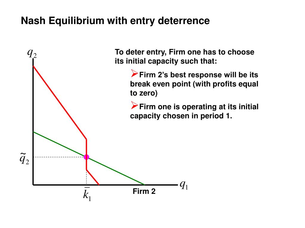 Nash Equilibrium with entry deterrence • To deter entry, Firm one has to choose its initial capacity such that: • Firm 2’s best response will be its break even point (with profits equal to zero) • Firm one is operating at its initial capacity chosen in period 1. Firm 2