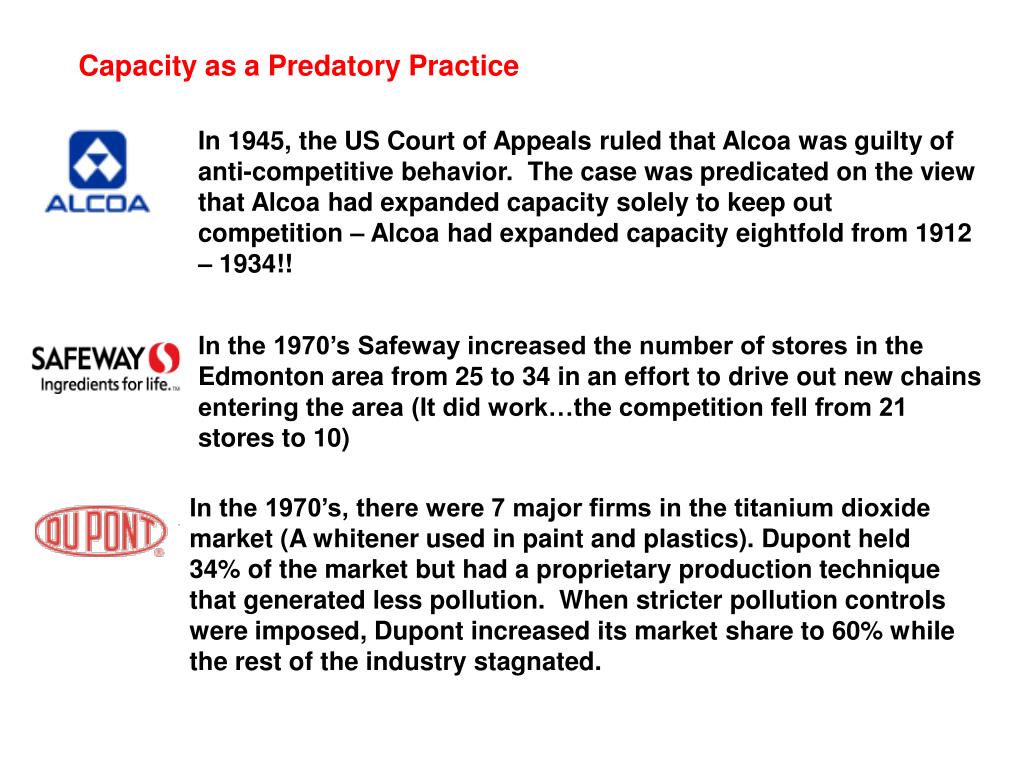 Capacity as a Predatory Practice In 1945, the US Court of Appeals ruled that Alcoa was guilty of anti-competitive behavior. The case was predicated on the view that Alcoa had expanded capacity solely to keep out competition – Alcoa had expanded capacity eightfold from 1912 – 1934!! In the 1970’s Safeway increased the number of stores in the Edmonton area from 25 to 34 in an effort to drive out new chains entering the area (It did work…the competition fell from 21 stores to 10) In the 1970’s, there were 7 major firms in the titanium dioxide market (A whitener used in paint and plastics). Dupont held 34% of the market but had a proprietary production technique that generated less pollution. When stricter pollution controls were imposed, Dupont increased its market share to 60% while the rest of the industry stagnated.