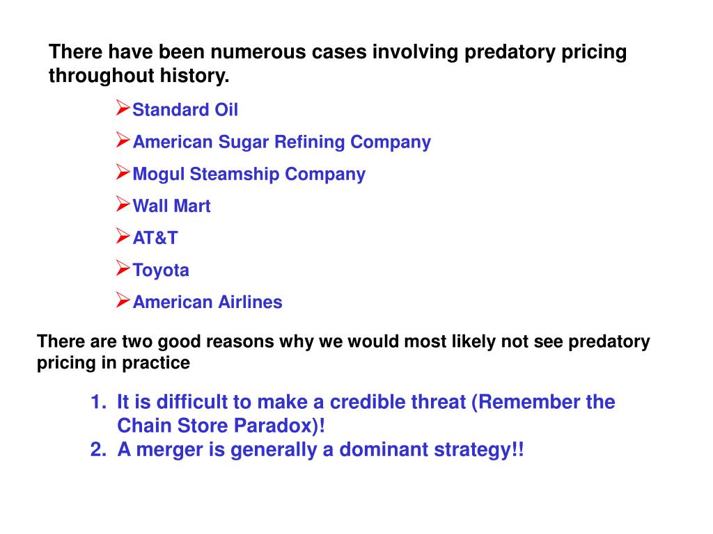 There have been numerous cases involving predatory pricing throughout history. • Standard Oil • American Sugar Refining Company • Mogul Steamship Company • Wall Mart • AT&T • Toyota • American Airlines There are two good reasons why we would most likely not see predatory pricing in practice • It is difficult to make a credible threat (Remember the Chain Store Paradox)! • A merger is generally a dominant strategy!!