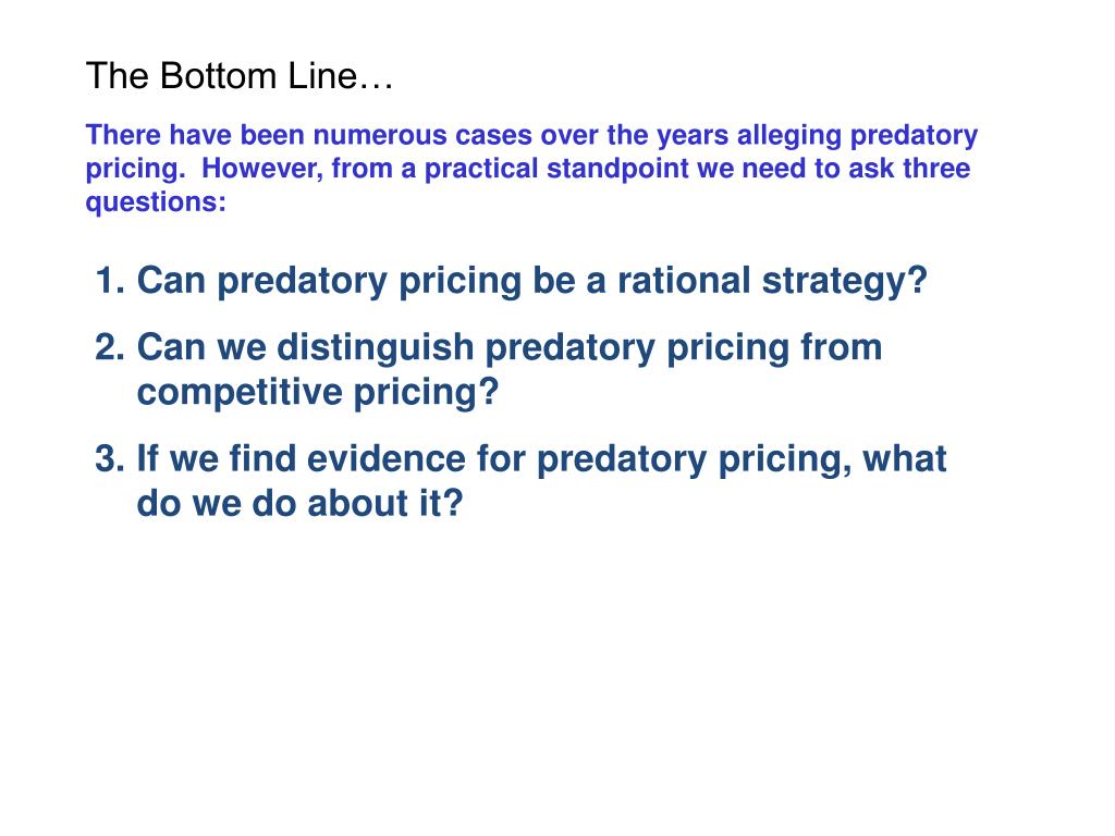 The Bottom Line… There have been numerous cases over the years alleging predatory pricing. However, from a practical standpoint we need to ask three questions: • Can predatory pricing be a rational strategy? • Can we distinguish predatory pricing from competitive pricing? • If we find evidence for predatory pricing, what do we do about it?