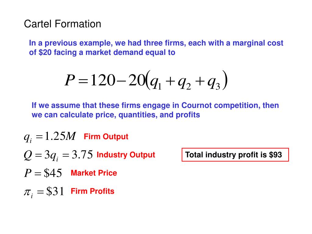 Cartel Formation In a previous example, we had three firms, each with a marginal cost of $20 facing a market demand equal to If we assume that these firms engage in Cournot competition, then we can calculate price, quantities, and profits Firm Output Industry Output Total industry profit is $93 Market Price Firm Profits