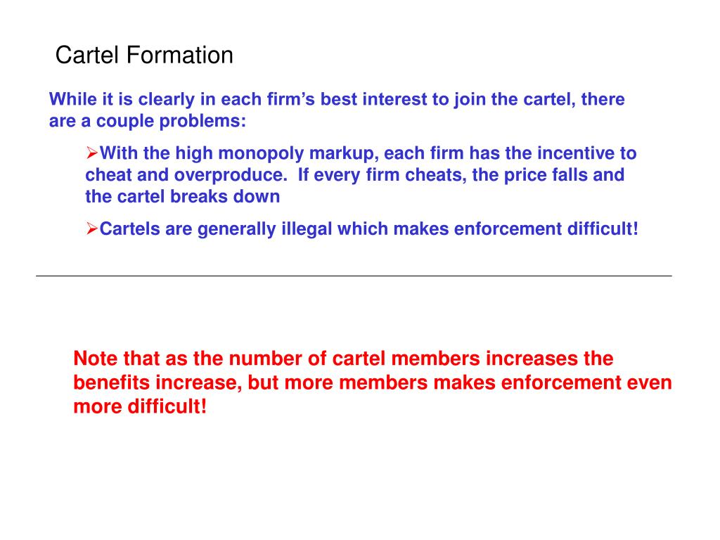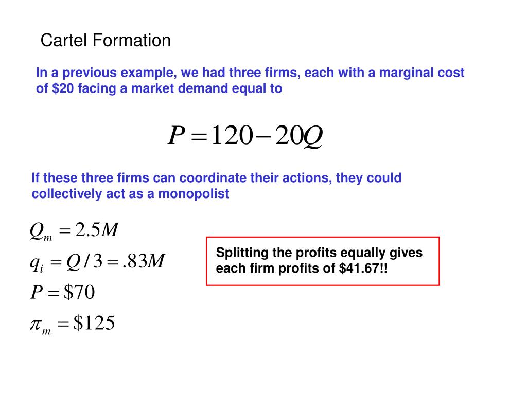 Cartel Formation In a previous example, we had three firms, each with a marginal cost of $20 facing a market demand equal to If these three firms can coordinate their actions, they could collectively act as a monopolist Splitting the profits equally gives each firm profits of $41.67!!