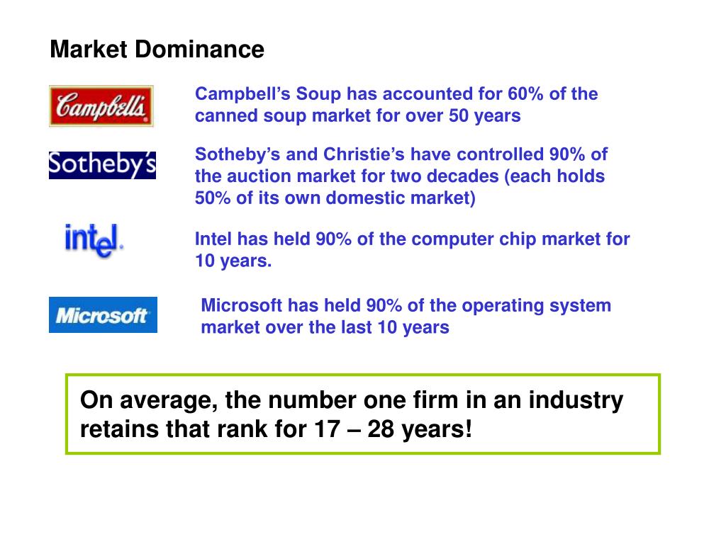 Market Dominance Campbell’s Soup has accounted for 60% of the canned soup market for over 50 years Sotheby’s and Christie’s have controlled 90% of the auction market for two decades (each holds 50% of its own domestic market) Intel has held 90% of the computer chip market for 10 years. Microsoft has held 90% of the operating system market over the last 10 years On average, the number one firm in an industry retains that rank for 17 – 28 years!