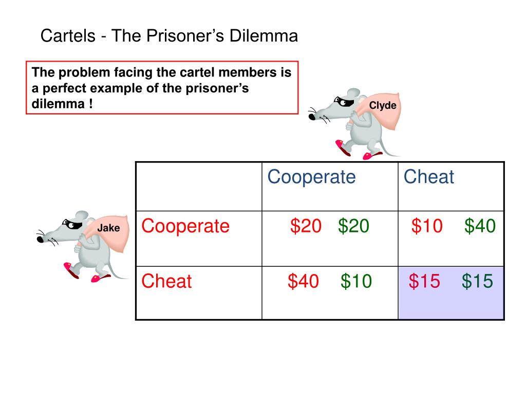 Cartels - The Prisoner’s Dilemma The problem facing the cartel members is a perfect example of the prisoner’s dilemma ! Clyde Jake