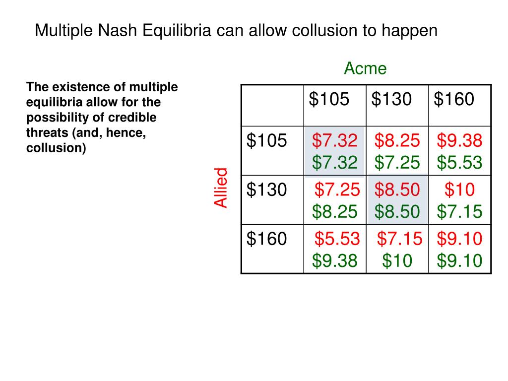 Multiple Nash Equilibria can allow collusion to happen Acme As in the previous case, a price of $160 can’t be enforced in the last period of play, which causes things to unravel Allied Consider this strategy: “We both charge $160 until the last period. That period we will both charge $130. If you cheat, I will punish you by charging $105.